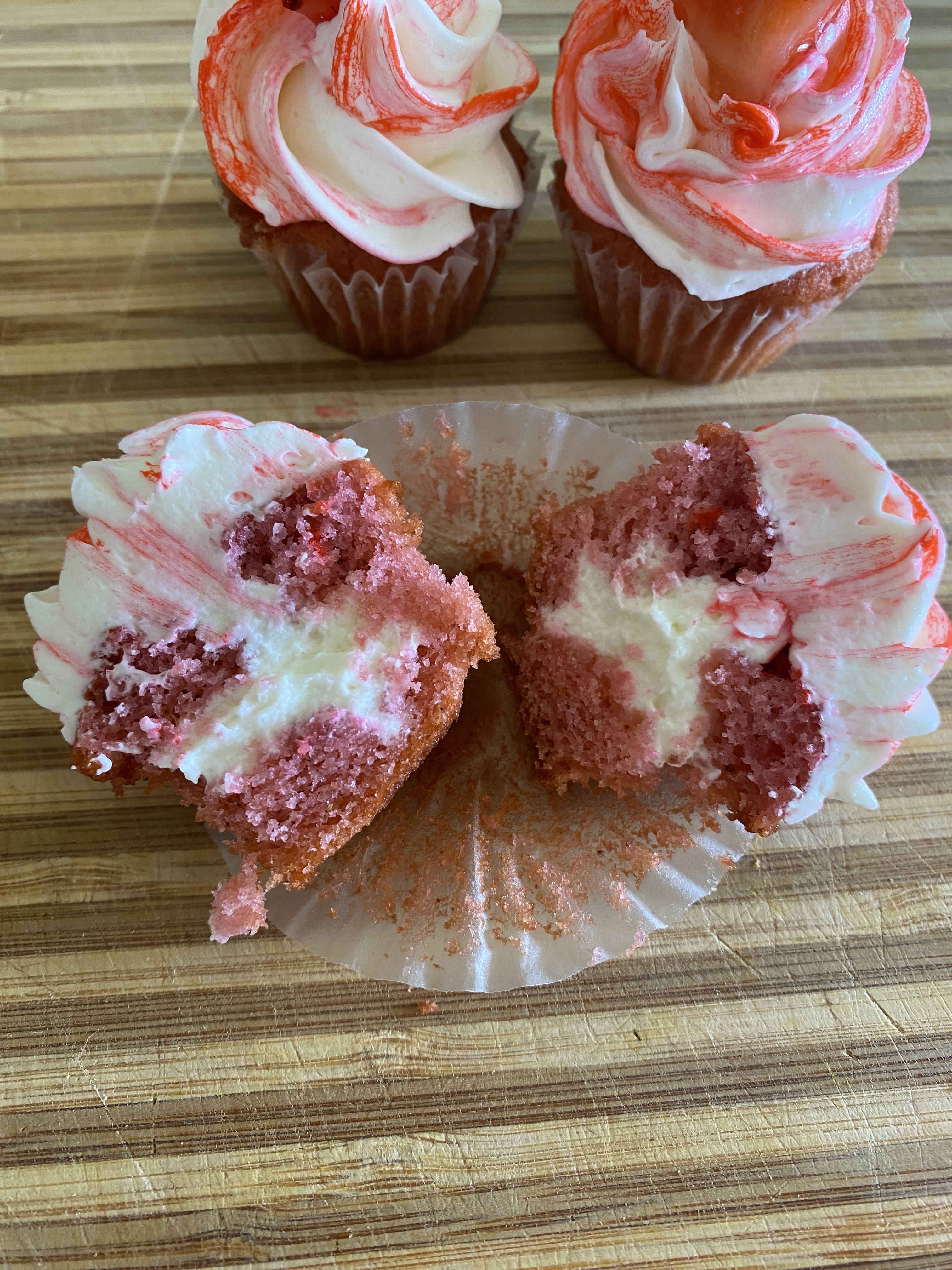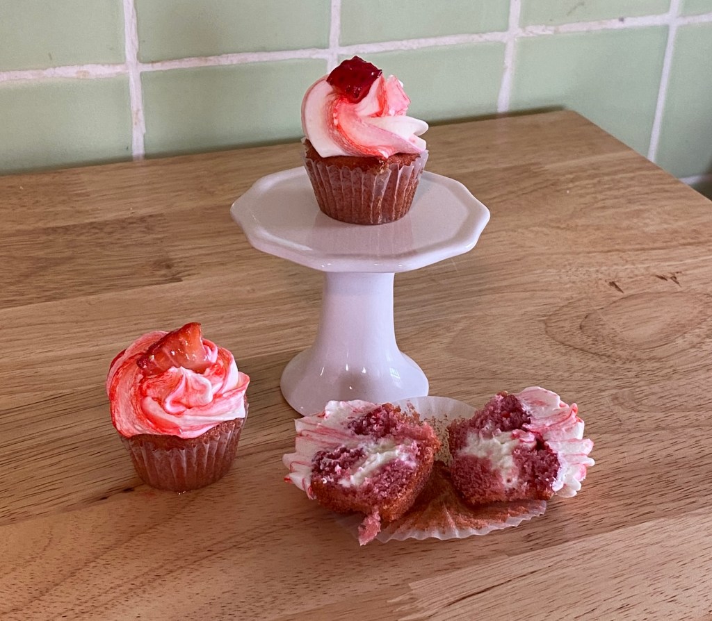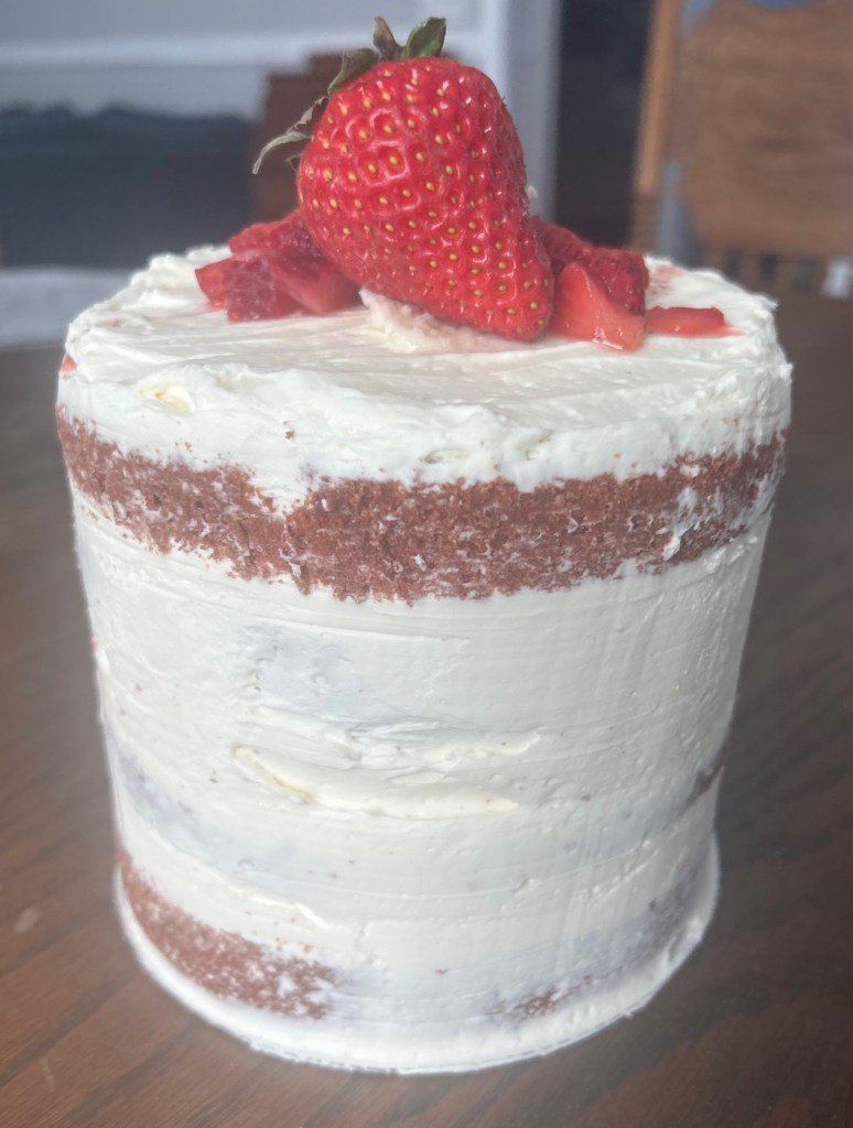 Strawberry cake layered with white chocolate whipped cream and fresh sliced strawberries, covered in buttercream.