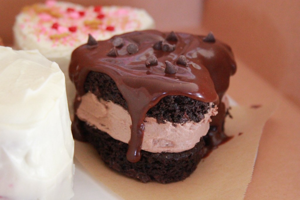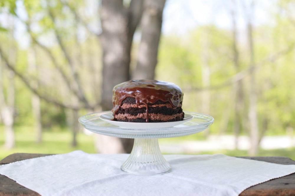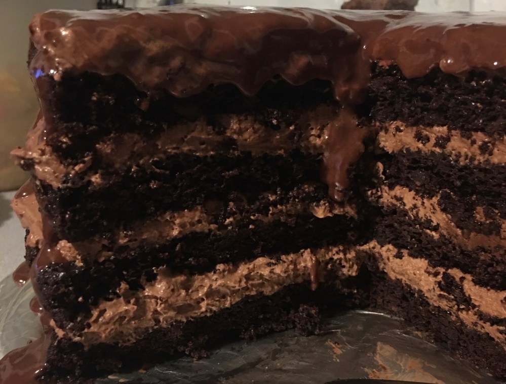 Mom’s Chocolate Cake is 3 layers of semi-sweet chocolate mousse, sandwiched between 4 layers of fluffy chocolate buttermilk cake, and topped with a lightly sweetened chocolate ganache.