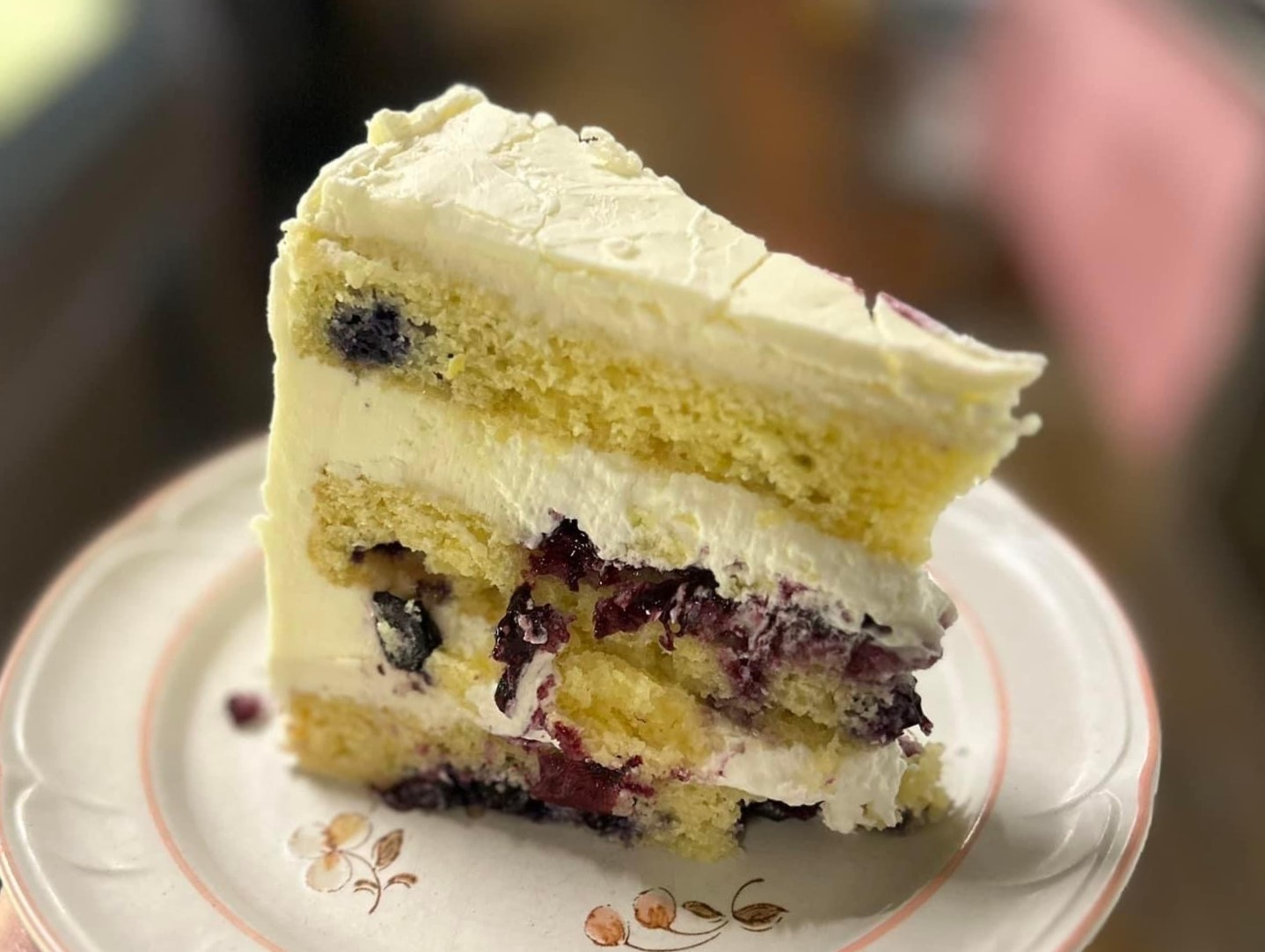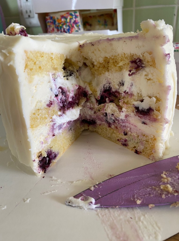 Lemon cake with fresh blueberries, layered with more blueberries, vanilla bean whipped cream, covered in tangy Cream Cheese frosting.