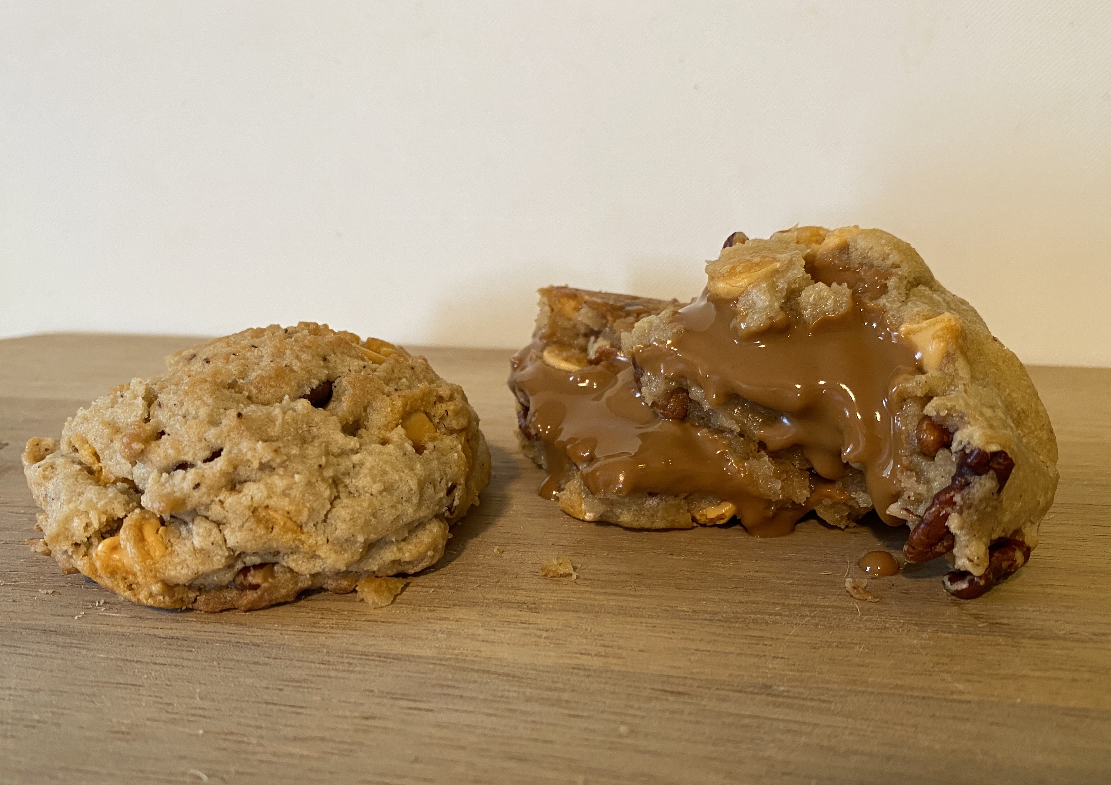 Sweet and buttery dough with butter toasted pecans, butterscotch chips, and stuffed with Cookie Butter.