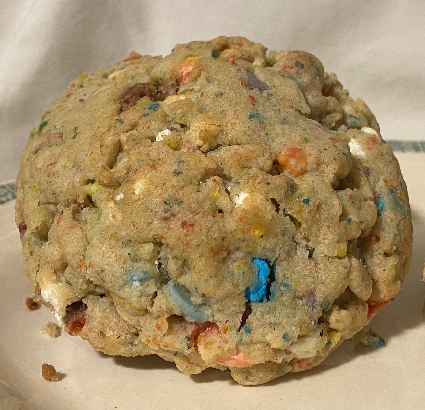 A slightly cakey, buttery dough with white chocolate chips, fruity rice cereal and fruity marshmallow cereal. This cookie is as pretty as it is delicious!