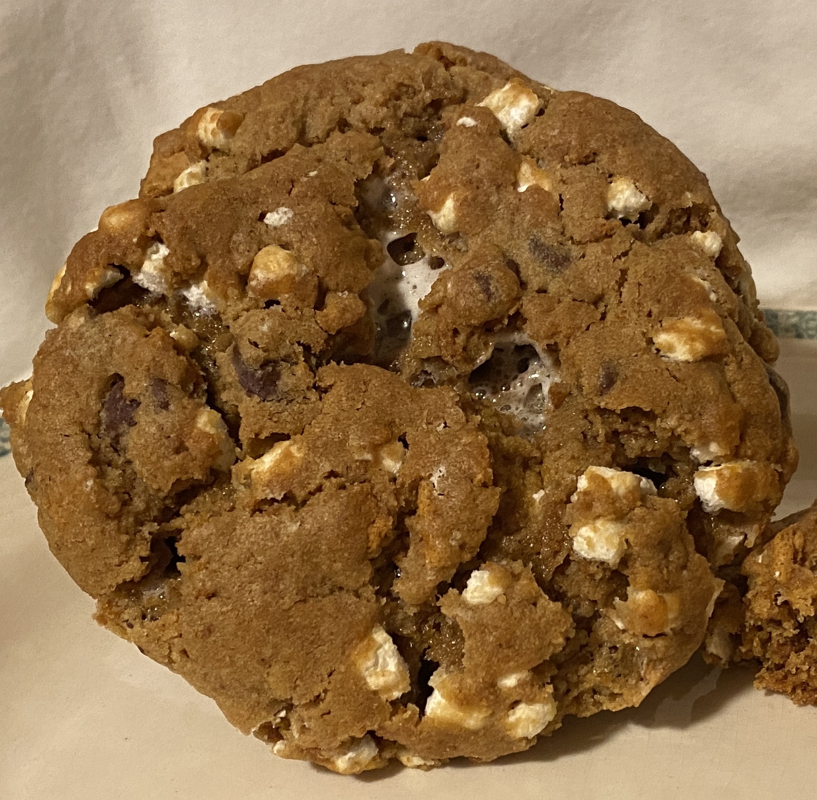 Graham cracker dough with milk chocolate chips, dried mini marshmallows, graham cracker bits, and stuffed with marshmallow.